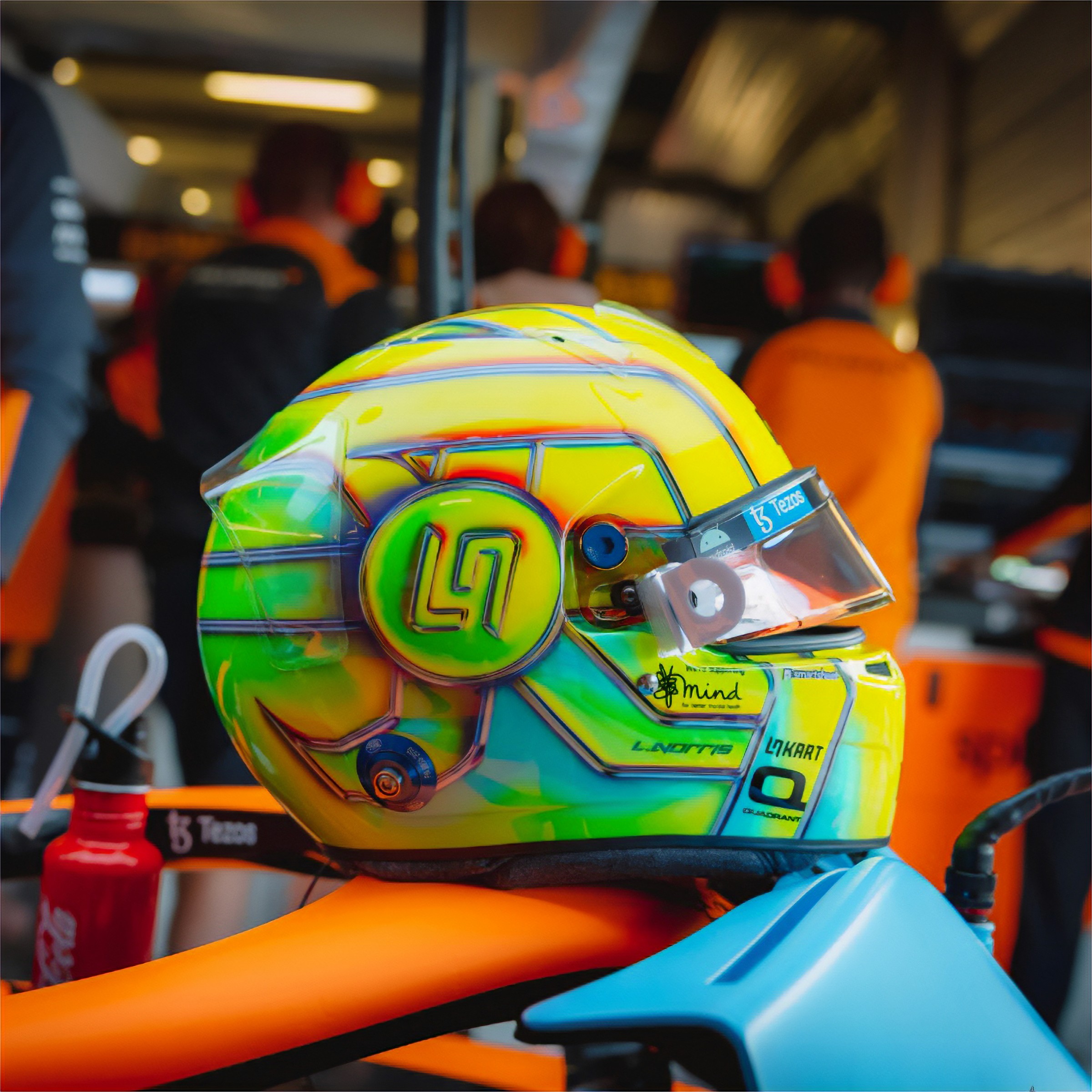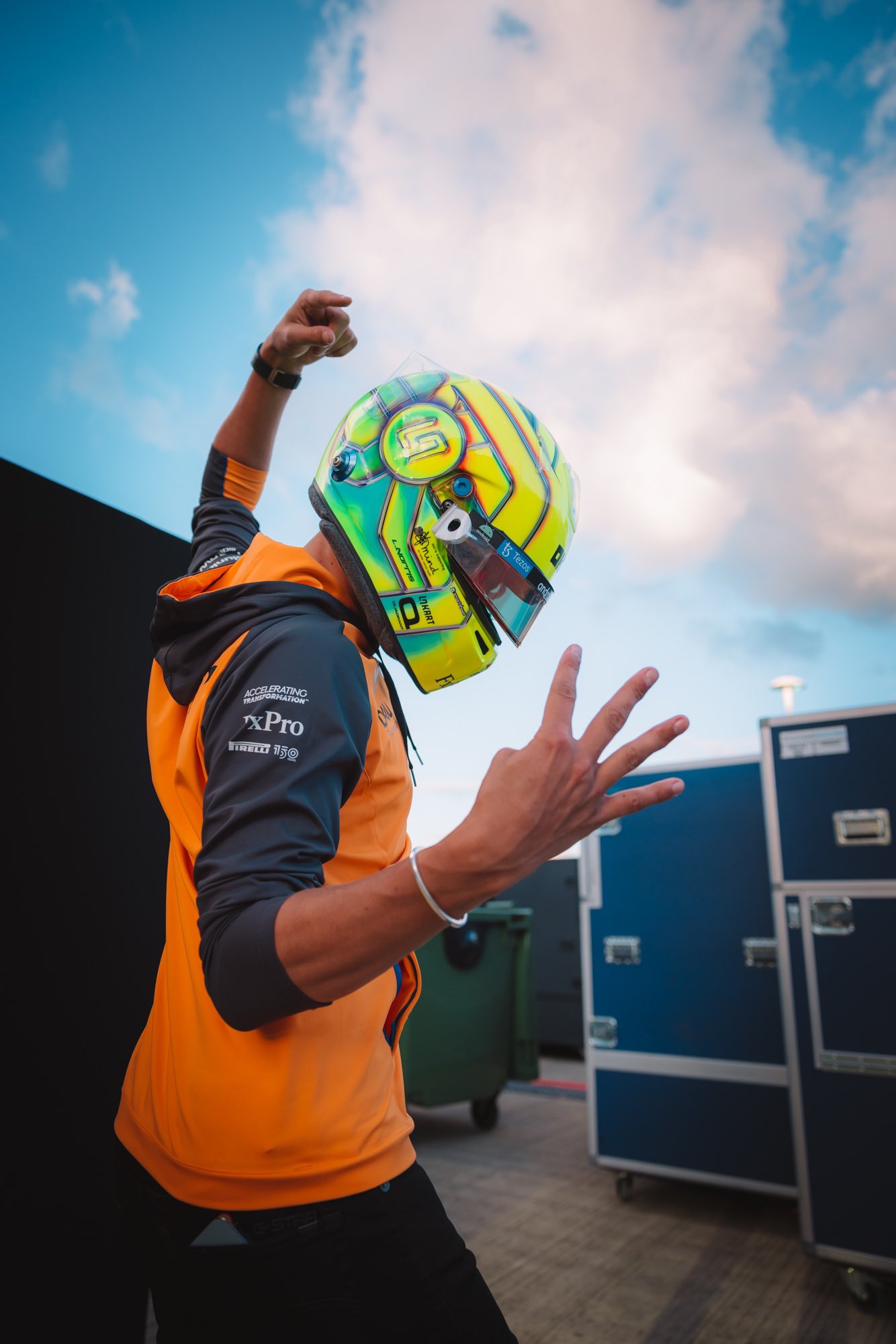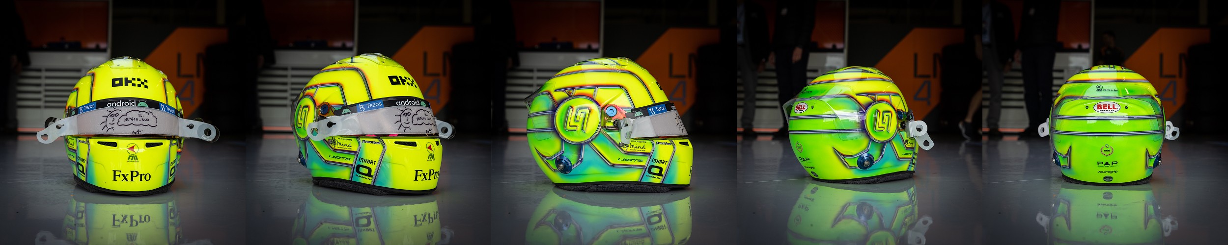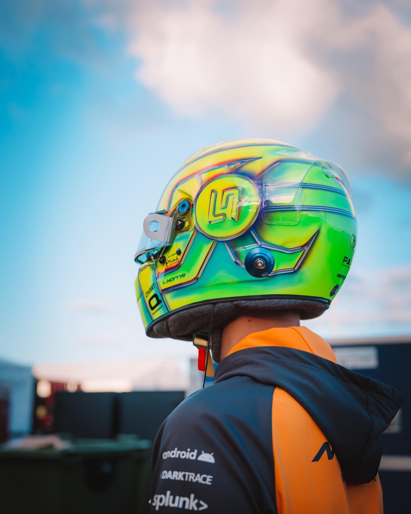 In close collaboration with the motorsport agency wearegrip, a special helmet design for F1 driver Lando Norris has been created for the 2022 British Grand Prix at Silverstone. The basic shape picks up the standard helmet design and the neon green as the driver's brand colour in a vivid chrome style. This edition is called "Liquid Neon Metal". In addition to the unique original helmet, mini helmets in 1:2 scale are also available for fans and followers.