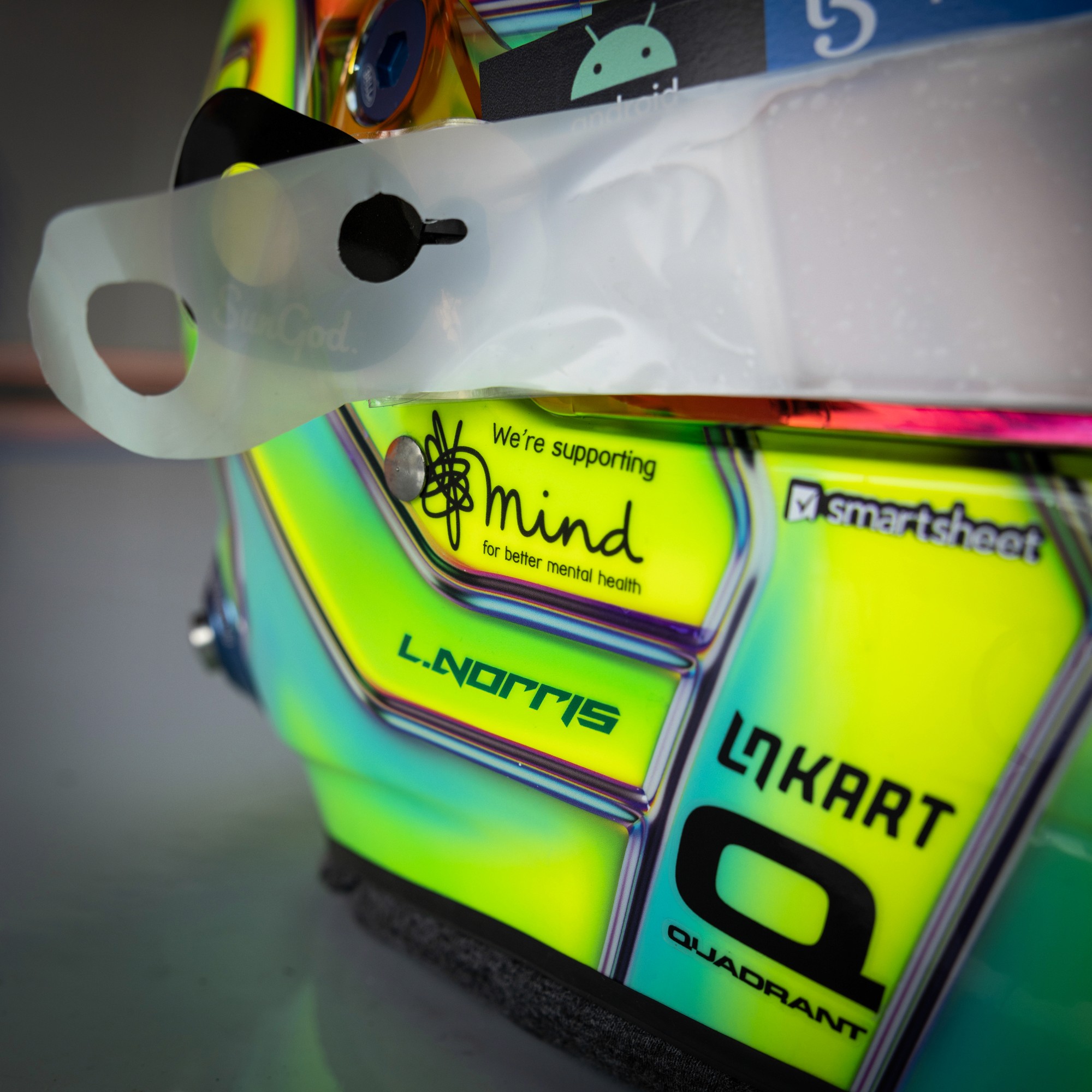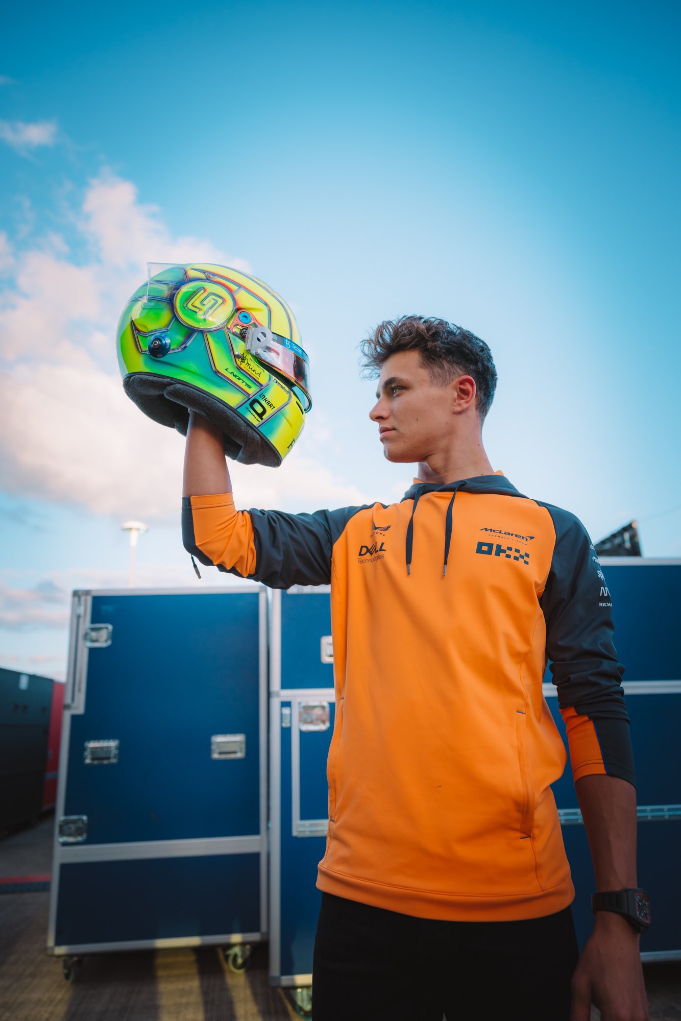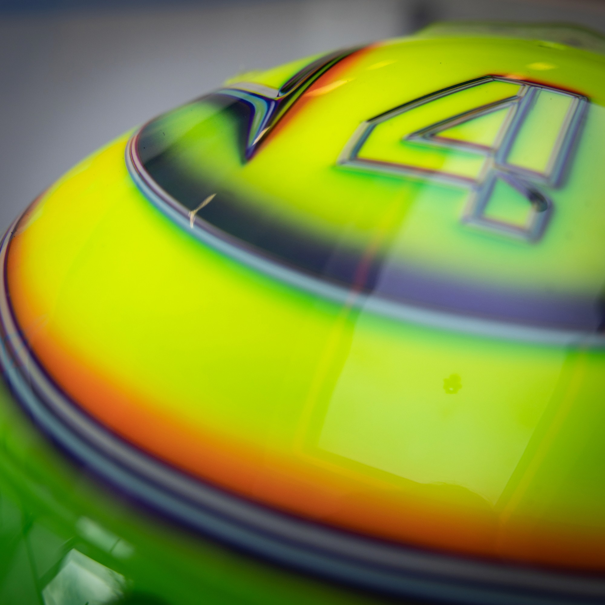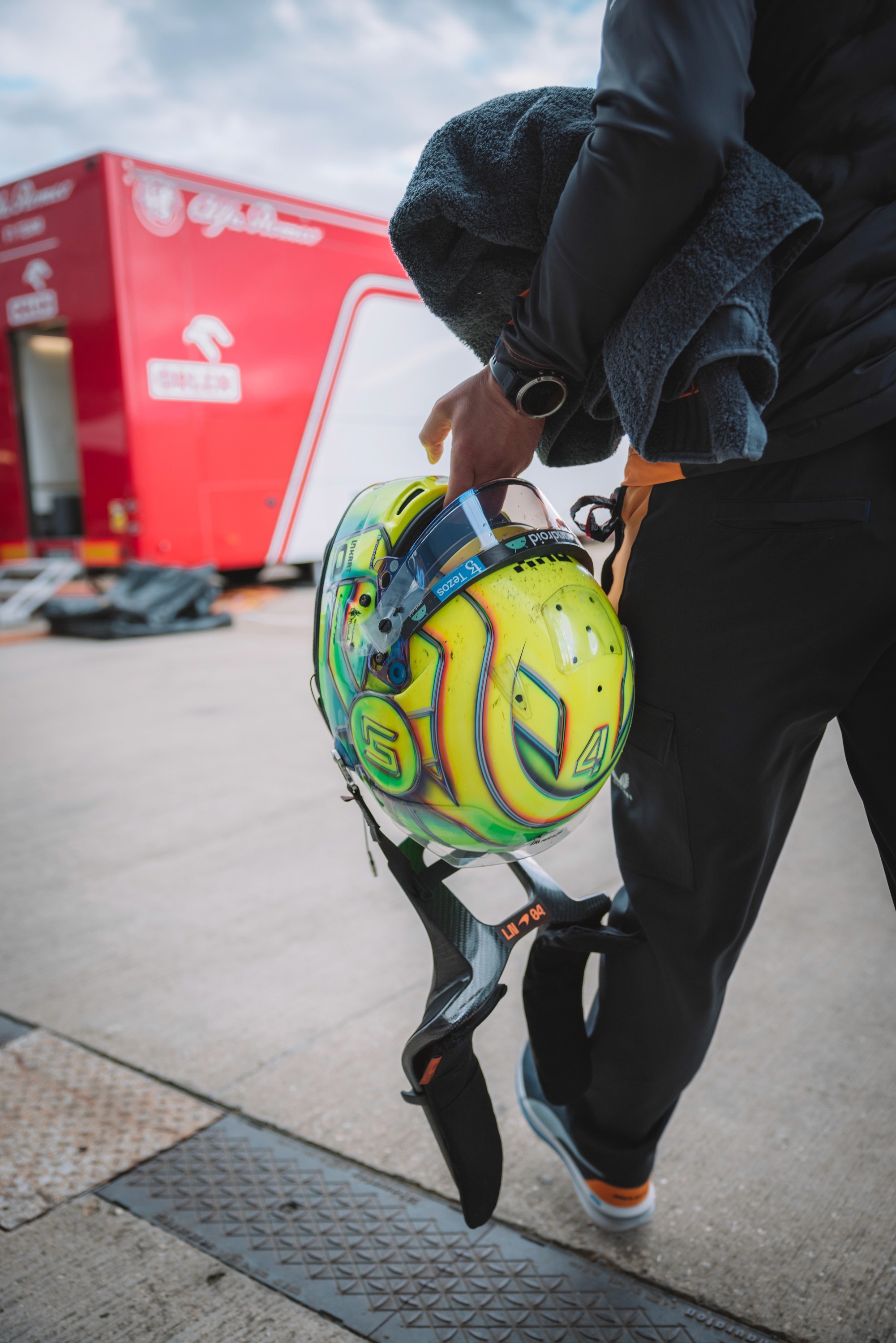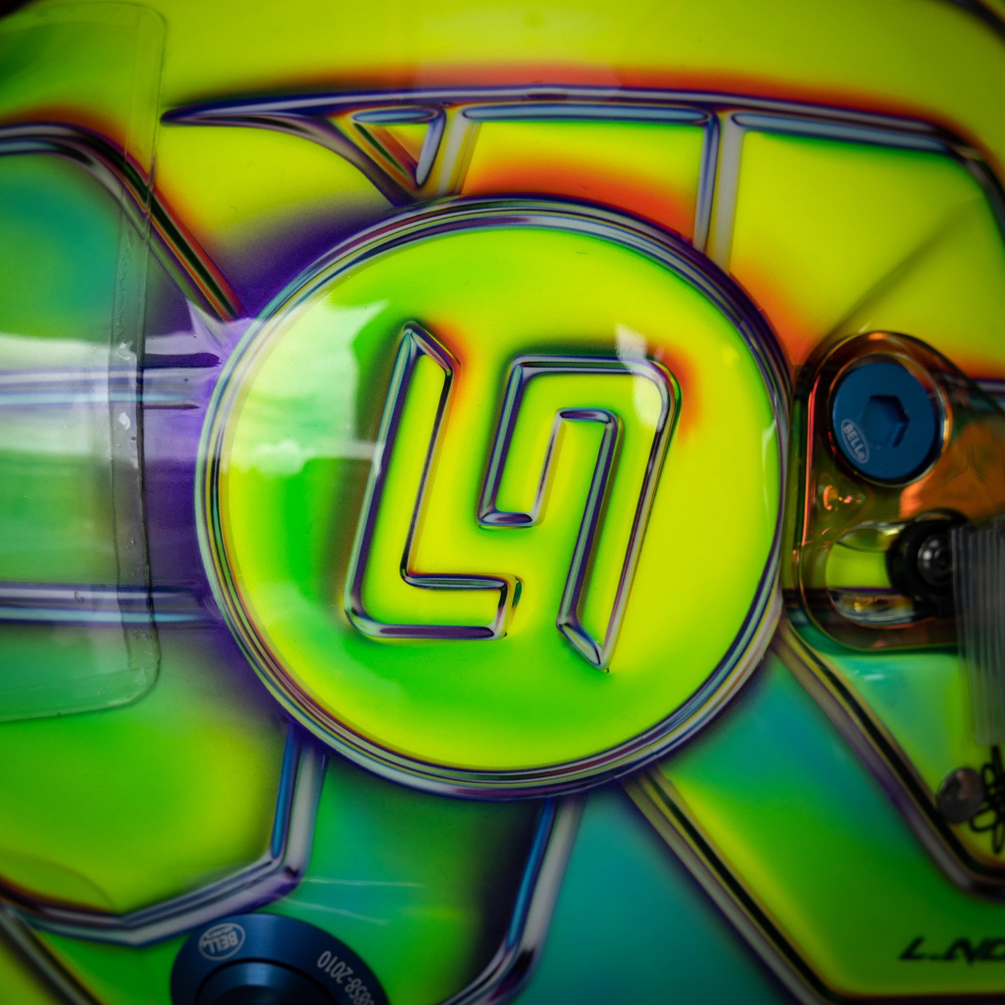 In close collaboration with the motorsport agency wearegrip, a special helmet design for F1 driver Lando Norris has been created for the 2022 British Grand Prix at Silverstone. The basic shape picks up the standard helmet design and the neon green as the driver's brand colour in a vivid chrome style. This edition is called "Liquid Neon Metal". In addition to the unique original helmet, mini helmets in 1:2 scale are also available for fans and followers.